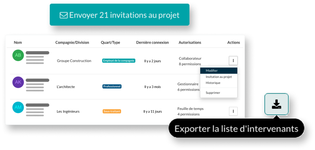 Cette section vous permet de gérer efficacement les membres de votre équipe, de superviser les personnes qui travaillent sur le projet et d’accéder facilement à leurs coordonnées, améliorant ainsi leur coordination et performance.